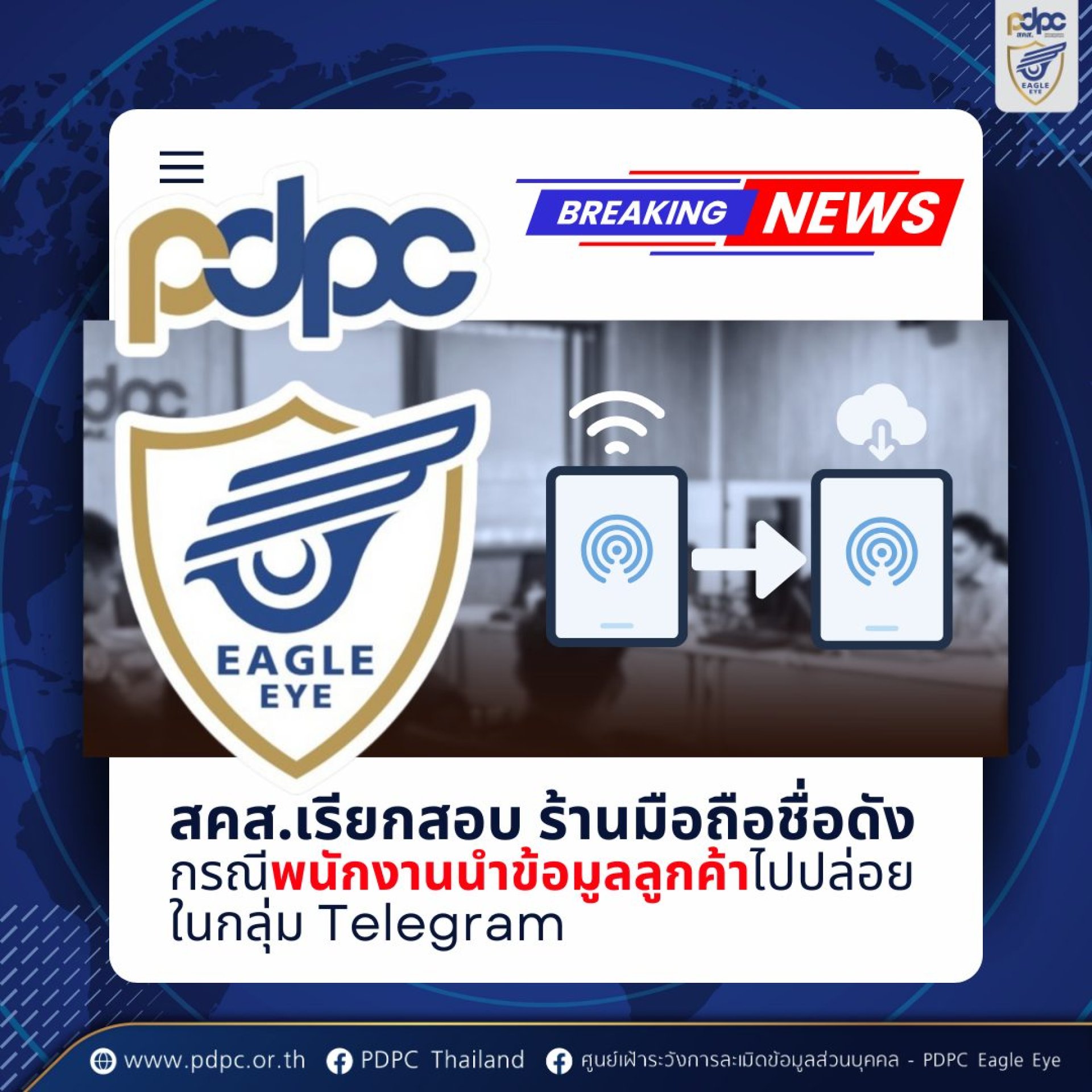 สคส. โดย ศูนย์เฝ้าระวังการละเมิดข้อมูลส่วนบุคคล (PDPC Eagle Eye) เรียกสอบร้านมือถือชื่อดัง กรณีพนักงานนำข้อมูลลูกค้าไปปล่อยในกลุ่ม Telegram